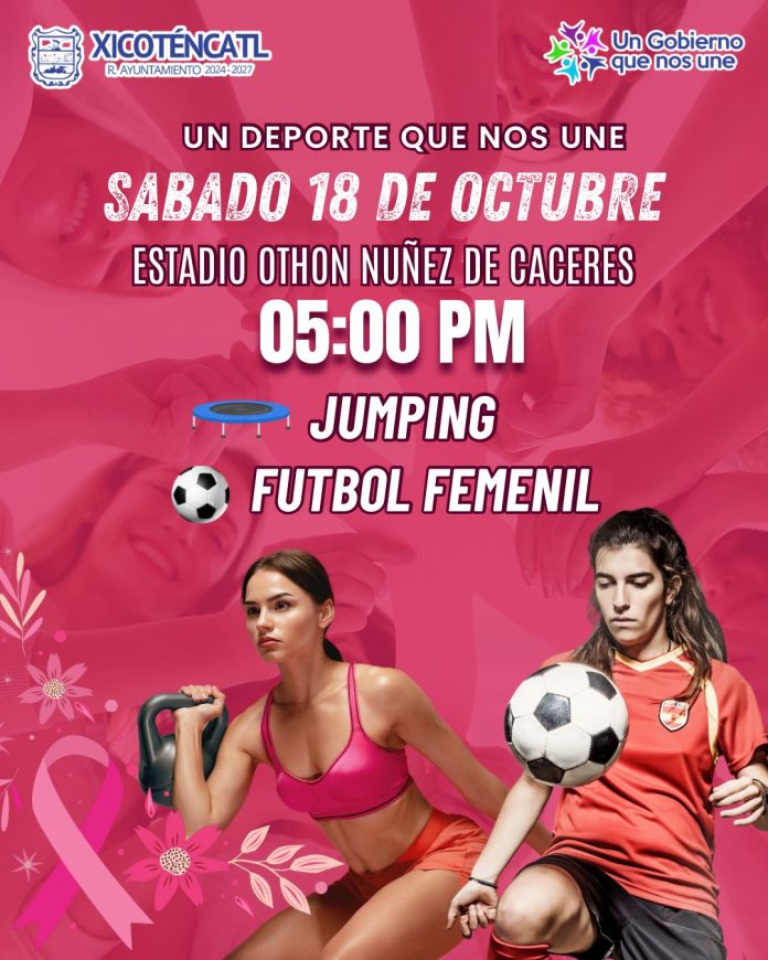 El Ayuntamiento de Xicoténcatl invita a toda la ciudadanía a disfrutar de una tarde deportiva este sábado 18 de octubre a las 5:00 PM en el Estadio Othón Núñez de Cáceres, donde se realizarán actividades de jumping y un encuentro de fútbol femenil.