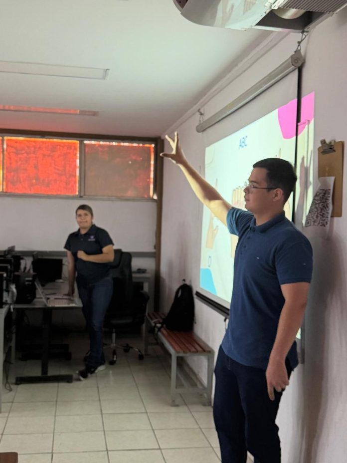 Reynosa, Tamaulipas.- Como parte de las políticas públicas y sociales en materia de inclusión, el Instituto de la Juventud de Tamaulipas (INJUVE) llevó a cabo el Taller de Lengua de Señas Mexicana en el Colegio de Bachilleres Plantel 07 de Reynosa (COBAT), con la participación de estudiantes, personal docente y de apoyo.