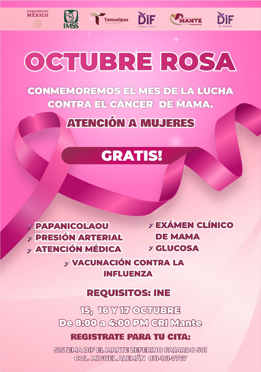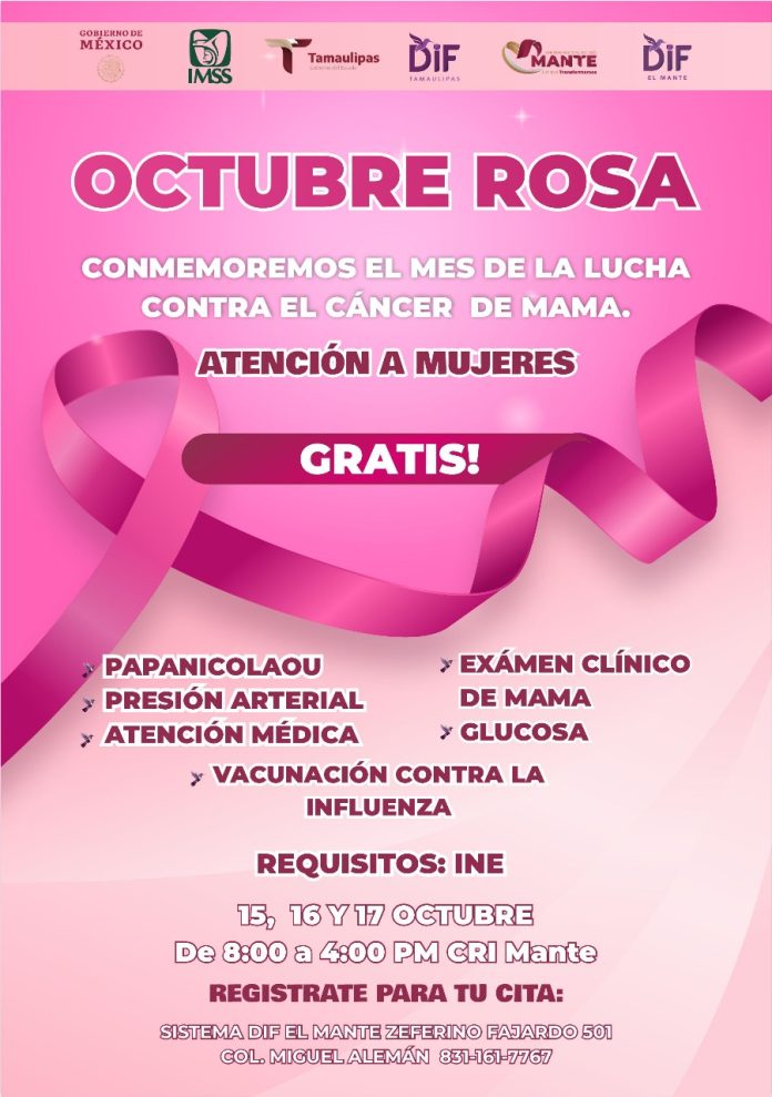 * El sistema DIF El Mante realizará campaña gratuita para detección oportuna de cáncer de mama los días 15, 16 y 17 de octubre.