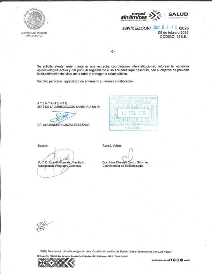 La alerta se desprende de un informe de resultados que dio positivo al virus de la rabia en ganado bovino dentro de la cabecera municipal de Villa Juárez. Debido a la proximidad geográfica y al flujo de actividades pecuarias, las autoridades sanitarias han activado protocolos de vigilancia para evitar que el virus se propague hacia el municipio de Cerritos y otras zonas colindantes.
