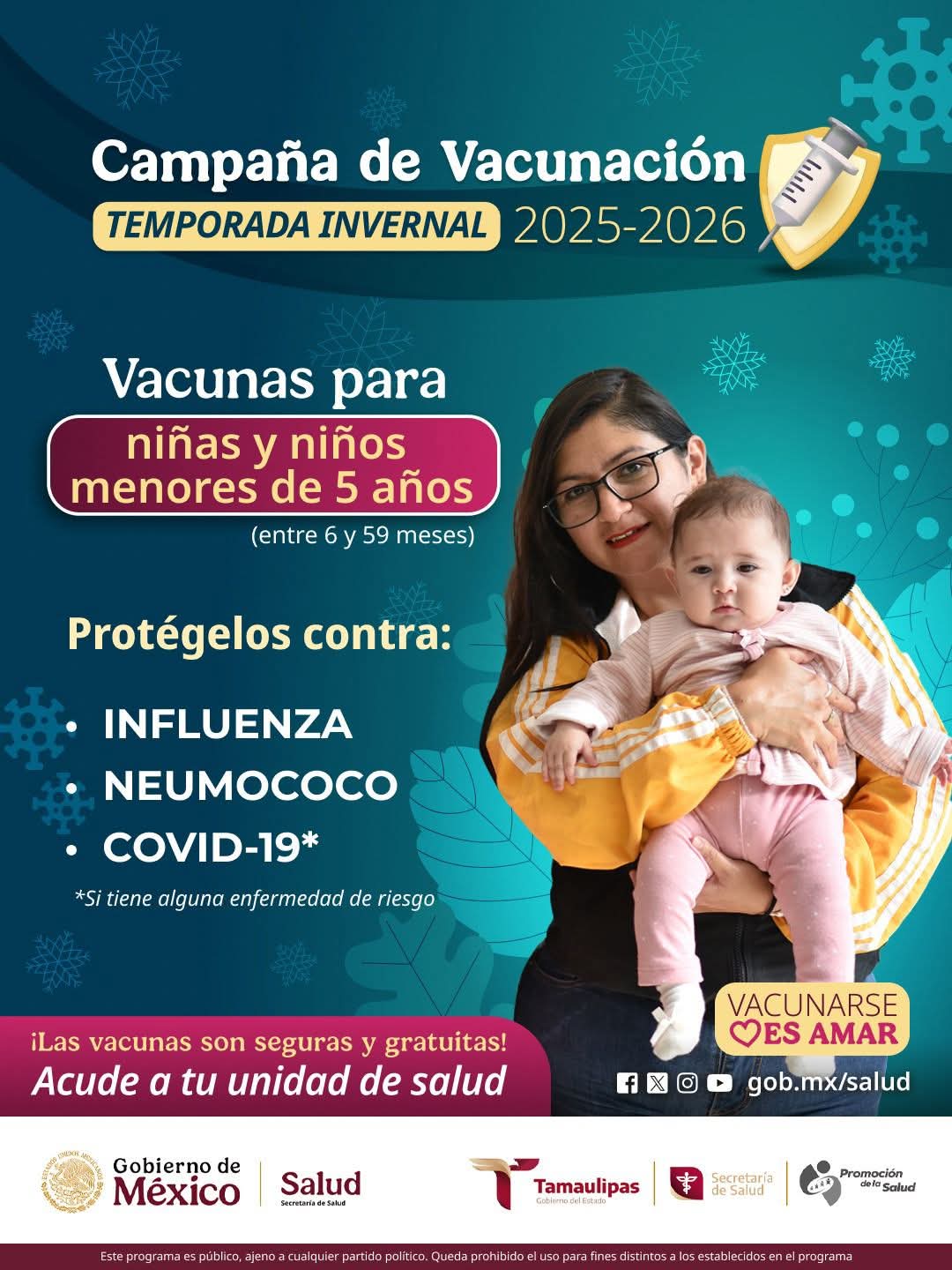 Con el compromiso del Gobernador Américo Villarreal Anaya de proteger la salud de las y los tamaulipecos sin seguridad social, la Secretaría de Salud de Tamaulipas, en coordinación con el IMSS-Bienestar, anunció el reforzamiento de la campaña de vacunación preventiva ante la próxima temporada invernal.