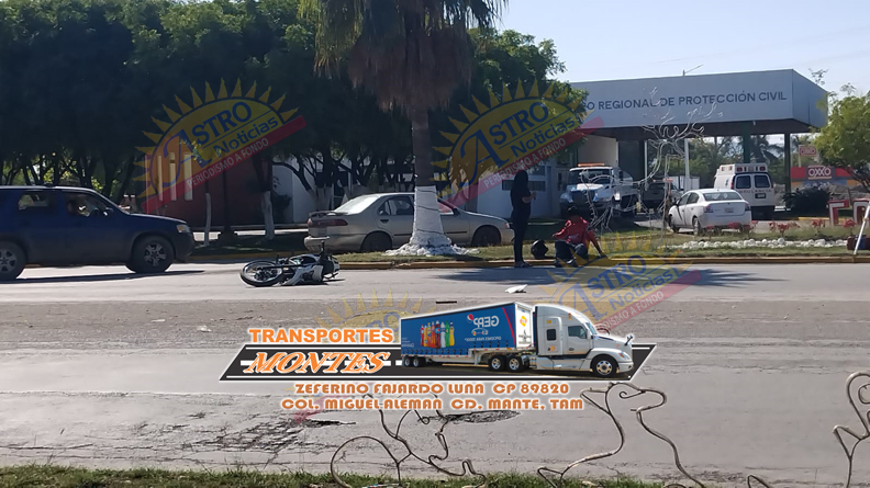En El Mante, Tamaulipas…Un repartidor de mandaditos terminó hospitalizado luego de verse involucrado en un accidente vial, al estrellarse con su motocicleta contra un vehículo que se le atravesó a su paso.