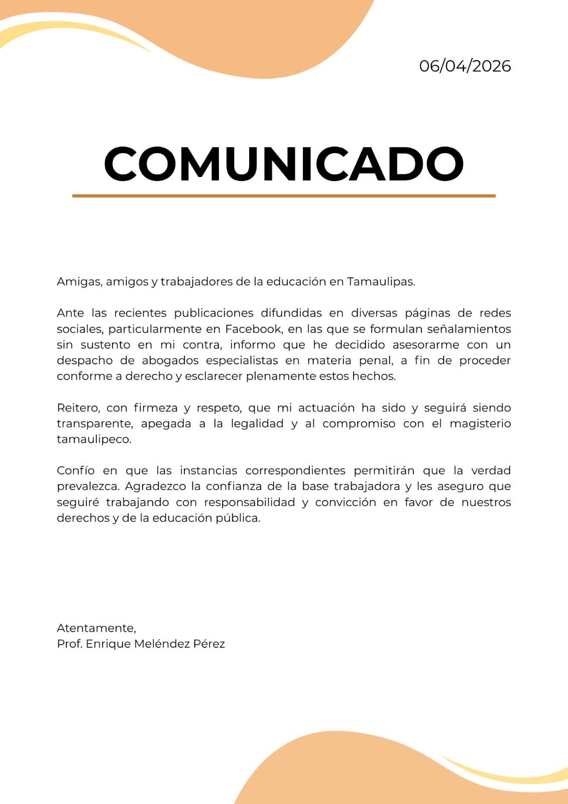 “Reitero, con firmeza y respeto, que mi actuación ha sido y seguirá siendo transparente, apegada a la legalidad y al compromiso con el magisterio tamaulipeco”, afirmó el profesor en el texto difundido este 6 de abril.