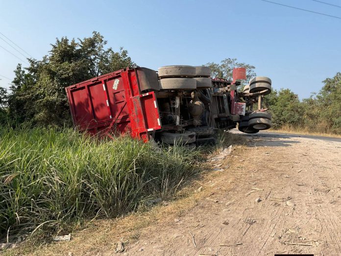 La caja, cargada con caña picada, perdió estabilidad y terminó volcada fuera de la superficie de rodamiento.