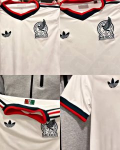 México volvería al clásico color blanco que ha caracterizado sus uniformes de visitante. La playera de Adidas tiene el logo moderno de ‘trébol’ y el escudo de la selección con rasgos verdes. La camiseta posee un patrón que hace referencia a las culturas prehispánicas; las líneas que van sobre el cuello, hombro y mangas, tienen los colores verde oscuro y rojo.