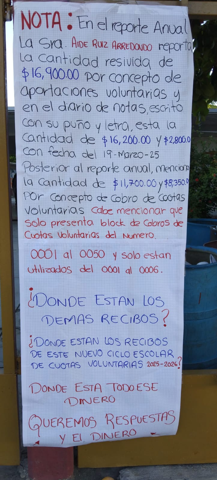 La Sra. Aide Ruiz Arredondo presentó su renuncia a su cargo, señalan en cartelones colocados en el cerco a un costado del acceso de la institución.