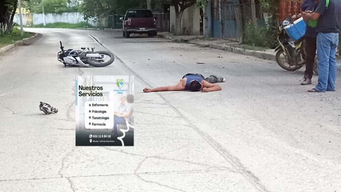 Pero fue en la esquina de Pablo L.Sidar y Paniagua dónde quedó lesionado luego de haber derrapado de una motocicleta Italika DM 250 tipo Cross.