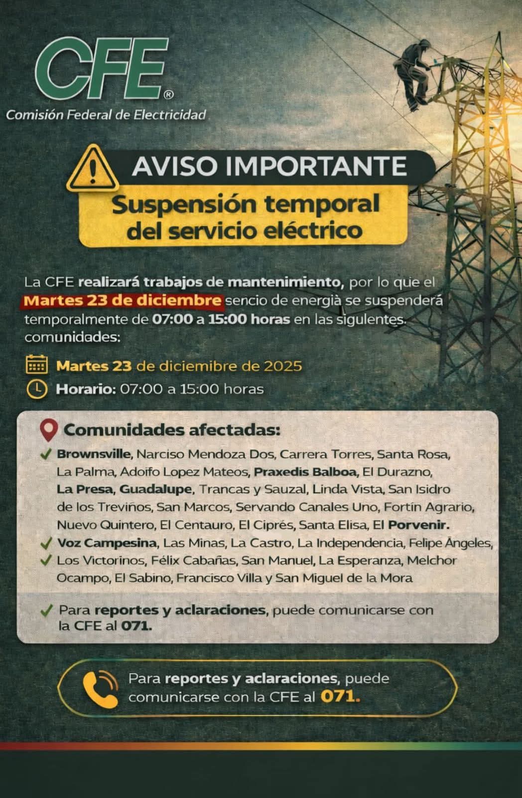 La Comisión Federal de Electricidad (CFE) realizará trabajos de mantenimiento el martes 23 de diciembre de 2025, en la zona de Xicoténcatl Tamaulipas.