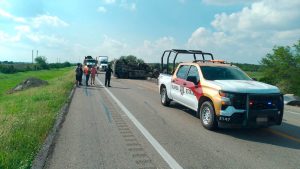 El reporte del C5, refirió una unidad de grandes dimensiones volcada en las inmediaciones del ejido Nuevo Quintero.