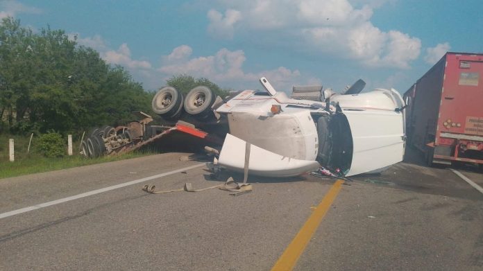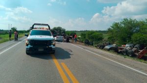 Personal de la Guardia Estatal de Apoyo Carretero atendió un accidente con volcadura de un tractocamión en la Carretera Federal 81, a la altura del kilómetro 30 en el municipio de González, en el que resultó una persona lesionada.