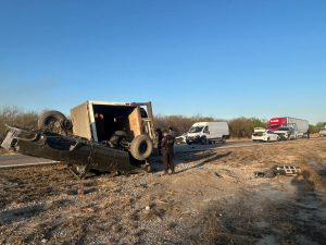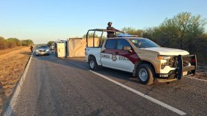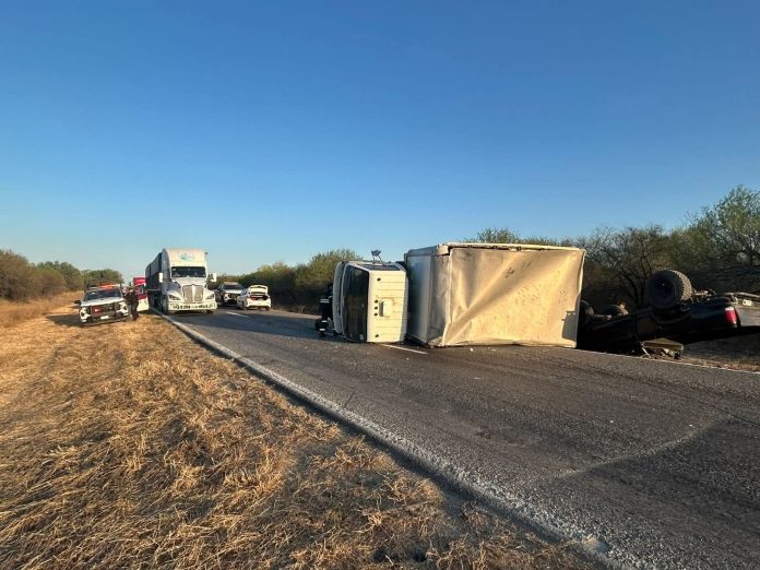 En Padilla, Tamaulipas…Un tráiler volcó en el kilómetro 54 de la carretera Victoria-Matamoros, a la altura de Padilla.